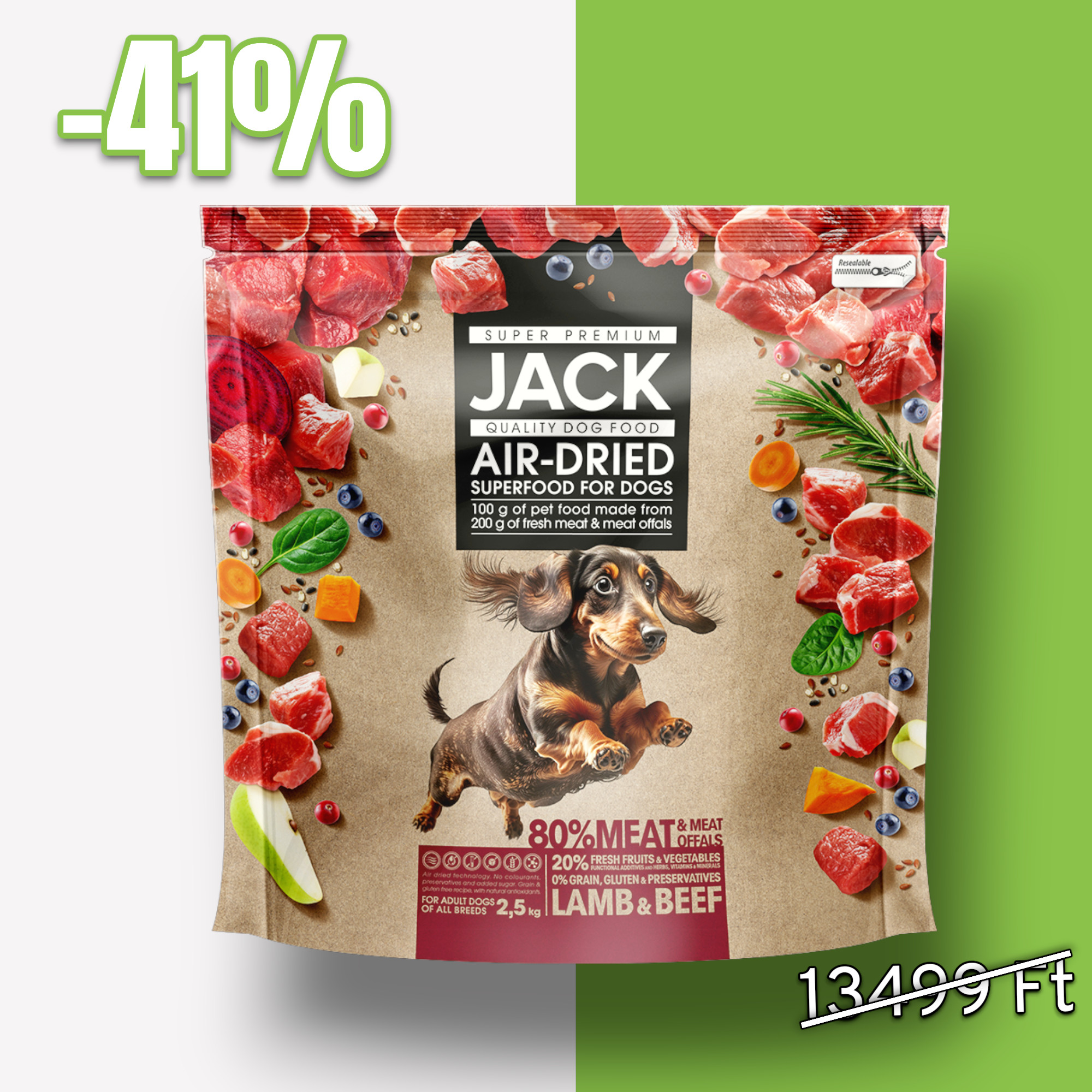 JACK Air-dried száraztáp báránnyal és marhával. Ez az eledel valódi SUPERFOOD, amely olyan innovatív étket kínál a kutyák számára, amely egyesíti a száraz tápok ropogós állagát a nedves eledel frissességével és ízletességével. A gyártási folyamat során alkalmazott, speciális és kíméletes szárítási módszer a lehető legtöbb tápanyagot megőrzi a felhasznált alapanyagokból. A rendkívül könnyen emészthető, étvágygerjesztő Air-dried eledel 100 grammja 200 gramm friss húst és állati belsőséget is tartalmaz. Bátran kínálható érzékeny gyomrú kutyusoknak. Ez az ízletes kutyaeledel 100 %-ig természetes összetevőkből áll, antibiotikus hatású. Gabonamentes, alacsony szénhidráttartalmú, fehérjedús, antioxidánsokban és rostban gazdag, természetes vitaminforrás.