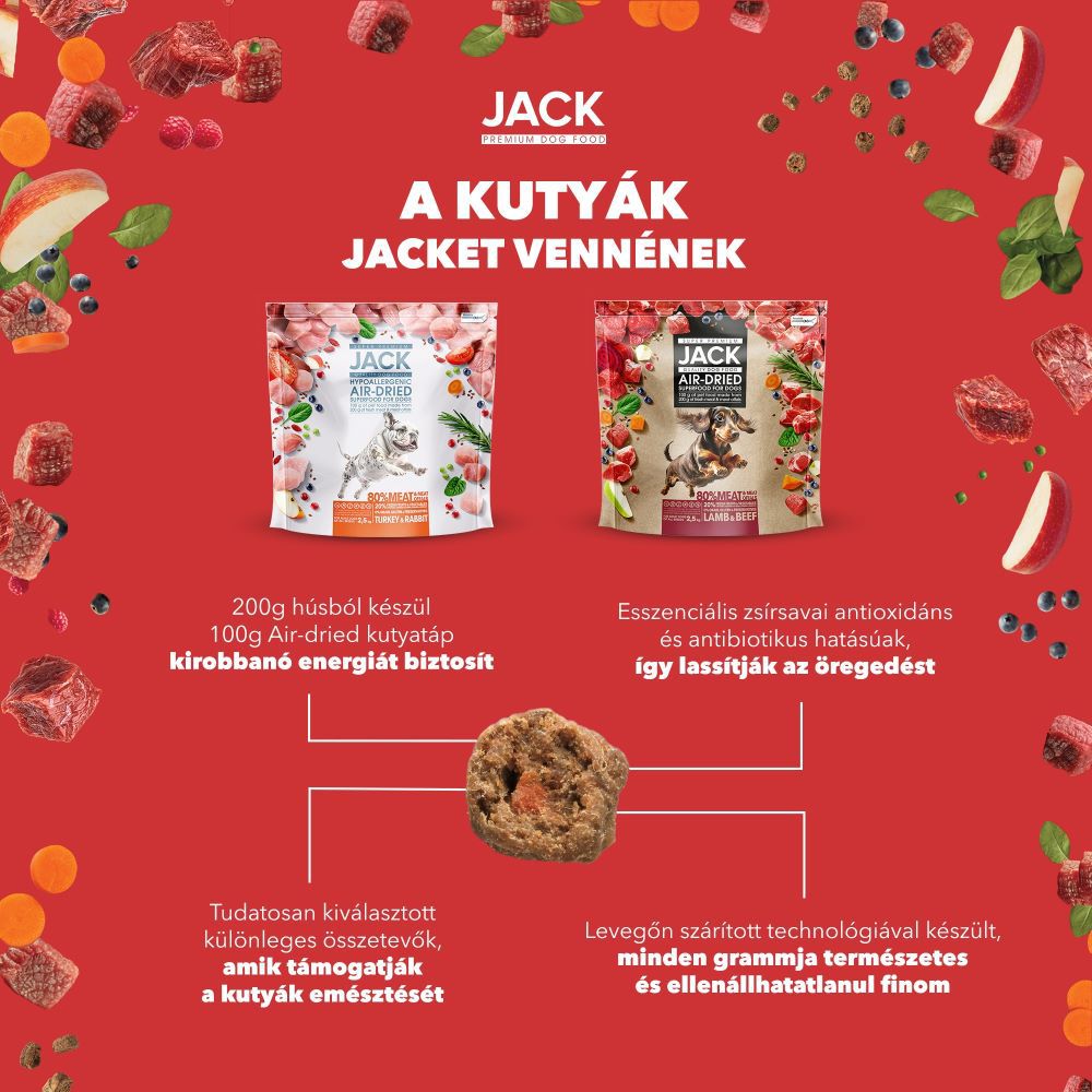 JACK Air-dried száraztáp báránnyal és marhával. Ez az eledel valódi SUPERFOOD, amely olyan innovatív étket kínál a kutyák számára, amely egyesíti a száraz tápok ropogós állagát a nedves eledel frissességével és ízletességével. A gyártási folyamat során alkalmazott, speciális és kíméletes szárítási módszer a lehető legtöbb tápanyagot megőrzi a felhasznált alapanyagokból. A rendkívül könnyen emészthető, étvágygerjesztő Air-dried eledel 100 grammja 200 gramm friss húst és állati belsőséget is tartalmaz. Bátran kínálható érzékeny gyomrú kutyusoknak. Ez az ízletes kutyaeledel 100 %-ig természetes összetevőkből áll, antibiotikus hatású. Gabonamentes, alacsony szénhidráttartalmú, fehérjedús, antioxidánsokban és rostban gazdag, természetes vitaminforrás.